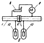 а - измерение сопротивления; б - определение эффективности действия; в -измерение и регулирование тока в шунтирующем резисторе, 1 - трубопровод; 2 - изолирующие фланцы; 3 - контакт с трубопроводом; 4 - многопредельный вольтметр; 5 - установка катодной защиты; 6 - точка дренажа; 7 - неполяризующийся медно-сульфатный электрод сравнения; 8 - регулировочный резистор; 9 - амперметр; 10 - токоотвод-протектор