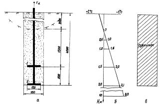 Схема к расчету двухдискового анкера: а - схема анкера; б - расчетная температура грунта; в - геологический разрез участка.