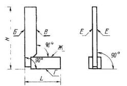 2.2. Допуск перпендикулярности измерительных поверхностей Б и В к опорным поверхностям Г и Ж для угольников всех типов на длине Н (для УЛ - на длине Н и L,) при температуре воздуха в помещении (20 ±3,5) °С и изменении температуры, не превышающем 0,5 °С/ч, не должен превышать значений, указанных в табл. 4.
