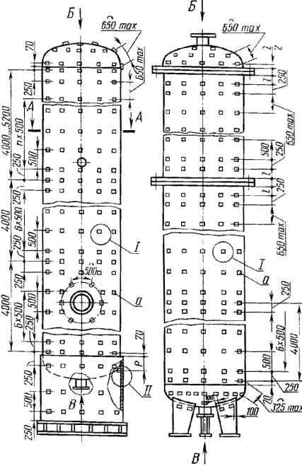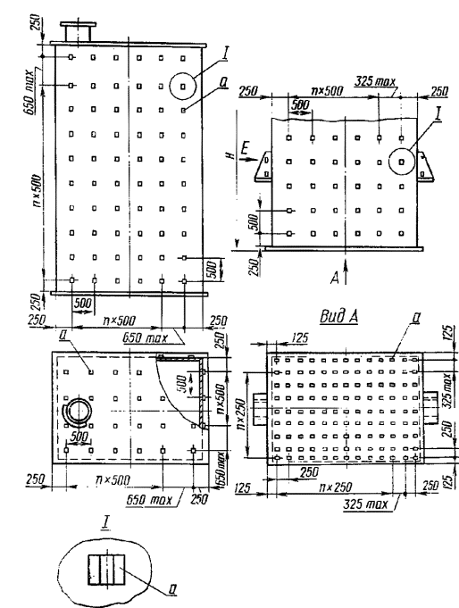 а) на вертикальных объектах: в вертикальном и горизонтальном направлениях с шагом 500 мм, отступив от анкерных болтов фланцевых соединений или сварных соединений либо сварных швов, соединяющих днища (крышки) и корпуса сосудов и аппаратов, на расстояния, указанные на черт. 1-3;