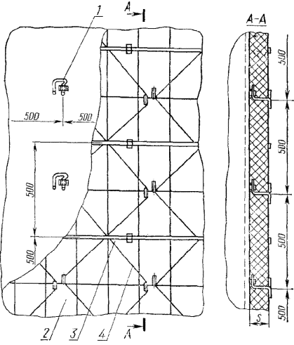 1. Тепловую изоляцию в виде изделия из мягких или полужестких волокнистых материалов (минеральной ваты, ваты из стеклянного волокна, асбеста) на связках или в обкладках при толщине слоя до 100 мм крепят устройством исполнения 1 (черт. 1); при толщине слоя св. 100 до 260 мм ключ. - устройством исполнения 2 (черт. 4).