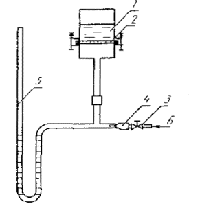 1 - жидкость, применяемая для испытаний, 2 - испытуемый фильтр, 3 - кран регулирования 4 - тормозной капилляр 5 - U-образный манометр, 6 - направление подачи профильтрованного воздуха