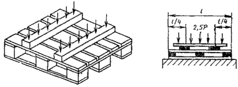 На середину верхнего настила поддона параллельно его ширине следует укладывать брус. Ширина бруса должна быть 100 мм, длина - больше ширины поддона. Через брус прикладывают в течение 30 мин. нагрузку Р, равную массе брутто поддона, после чего под брусом должно быть измерено значение прогиба верхнего настила.