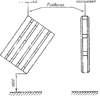 Поддон подвешивают за один из четырех углов так, чтобы нижний угол, подвергаемый удару, находился на одной вертикали с подвешиваемым углом на высоте 1000 мм от бетонной или металлической плиты (черт. 4).