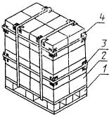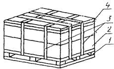 1 - средство пакетирования; 2 – груз; 3 - вертикальная обвязка; 4 - горизонтальная обвязка