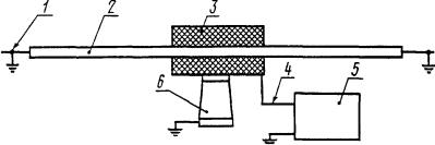 1 - токопроводящая жила или металлический покров кабельного изделия; 2 - изоляция, оболочка или защитный шланг; 3 - электрод; 4 - высоковольтный вывод, 5 - установка; 6 - изолятор