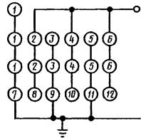 г) Все неэкранированные нечетные жилы всех повивов против всех неэкранированных четных жил всех повивов, соединенных с общей металлической оболочкой, экраном, броней или специальным электродом, при этом экранированные жилы в нумерации не участвуют и испытанию по данной схеме не подвергаются. Если в повивах одиночные неэкранированные жилы находятся между двумя экранированными жилами, то такие жилы в нумерации не участвуют и испытанию не подвергаются.