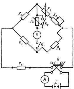 Е - источник постоянного тока; А - амперметр; G - гальванометр; rE - электрическое сопротивление, ограничивающее ток; r - реостат; П - переключатель для измерения направления тока при измерении; R1, R2, R'1, R'2, R'3 - электрическое сопротивление плеч моста; K1, K2 - ключи для включения н выключения гальванометра и защитного электрического сопротивления; RN - эталонное электрическое сопротивление; Rk - электрическое сопротивление, служащее для компенсации электрического сопротивления проводов, соединяющих кабельное изделие с мостом; r2 - электрическое сопротивление провода, соединяющего образцовое и измеряемое электрическое сопротивление двойного моста; r1 - защитное электрическое сопротивление гальванометра; RX - измеряемое электрическое сопротивление