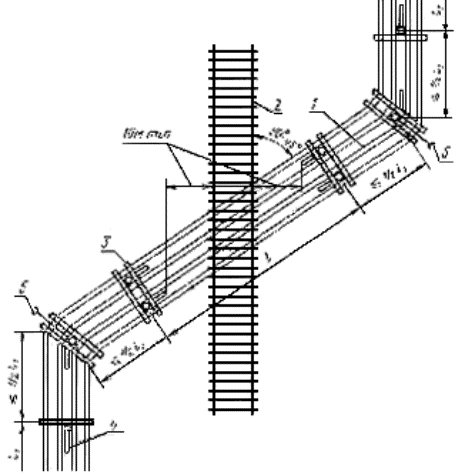 1 - линия ПВ; 2 - полотно трамвая или электрифицированной железной дороги постоянного тока или граница проезжей части дороги троллейбуса; 3 - переходная полуанкерная опора; 4 – подпора; 5 – оттяжка; l - пролет пересечения; l1 - пролет основной линии