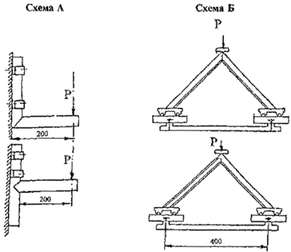 При испытаниях по схеме А образец одной из сторон жестко закрепляется к вертикальной или горизонтальной опоре. К другой стороне в плоскости образца прикладывают нагрузку (например, при помощи винтового приспособления). Величину нагрузки измеряют динамометром. Образцы нагружают до разрушения.