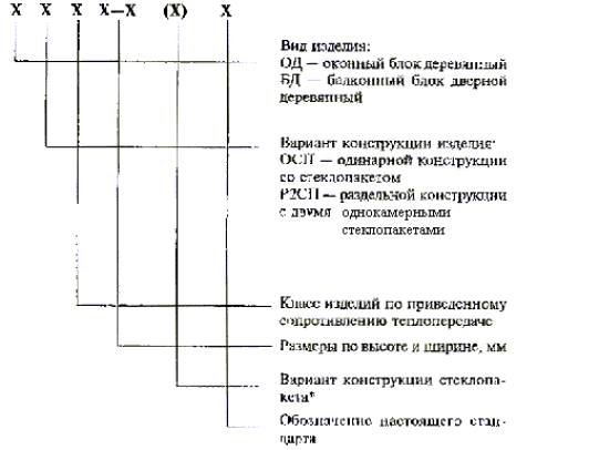 Пример условного обозначения - ОД ОСП В2 1760-1650 (4M1-16Ar-K4) ГОСТ 24700-99 - оконный деревянный блок одинарной конструкции со стеклопакетом, класса В2 по показателю приведенного сопротивления теплопередаче, высотой 1760 мм, шириной 1650 мм, с конструкцией стеклопакета: наружное стекло толщиной 4 мм марки М1 по ГОСТ 111, межстекольное расстояние 16 мм, заполненное аргоном, внутреннее стекло толщиной 4 мм с твердым теплоотражающим покрытием, по ГОСТ 24700.