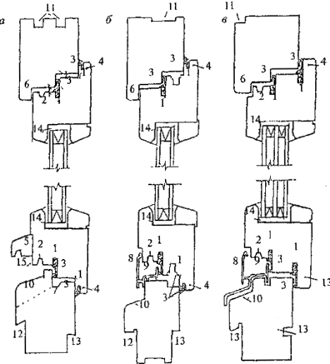 1 - паз под уплотняющую прокладку; 2 - капельник; 3 - зона притвора; 4 - наплав створки; 5 - отлив; 6 - наплав коробки; 7 - водоотводящий желоб; 8 - отлив (дождезащитный профиль); 9 - водоотводная канавка; 10 - уклон для отвода воды; 11 - пазы под соединительные шпонки и монтажные уплотнения; 12 - четверть под слив; 13 - четверть (паз) пол подоконную доску; 14 - четверть (фальц) под стеклопакет; 15 - внешняя щечка капельника