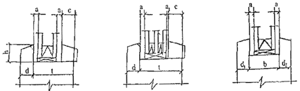 t - размер основания фальца (четверти под остекление); d (d1, d2), h - размеры боковой щечки опоры остекления; c - размеры опоры для крепления штапика; a, a1 - толщина внутренних слоев герметика; b - размер паза под стеклопакет