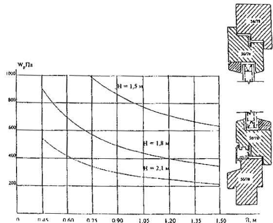 Рисунок Б.1 - Пример графического определения соотношения высоты Н и ширины В створчатых элементов с сечением брусков 56´78 мм в случае воздействия ветровой нагрузки W (для распашного и поворотно-откидного открывания, масса стеклопакета - не более 50 кг)