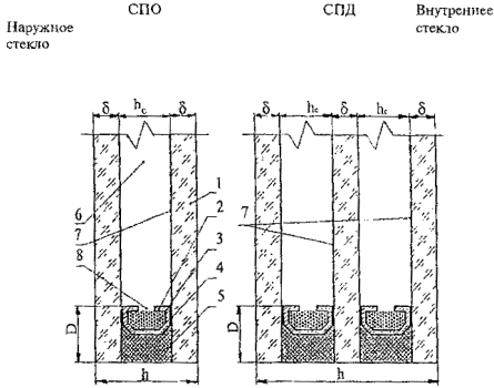 1 - стекло; 2 - дистанционная рамка; 3 - влагопоглотитель; 4 - нетвердеющий герметик; 5 - отверждающийся герметик; 6 - воздушная прослойка (межстекольное расстояние); 7 - рекомендуемые варианты расположения низкоэмиссионного покрытия в случае его применения; 8 - дегидрационные отверстия; d - толщина стекла; h - толщина стеклопакета; hc - расстояние между стеклами; D - глубина герметизирующего слоя