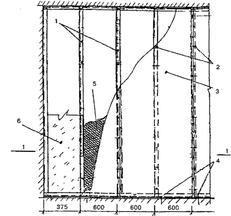 1 - каркас; 2 - шурупы; 3 - обшивка из гипсокартонных листов; 4 - дюбели; 5 - звукоизоляционный материал; 6 - заполнение из гипсокартонных листов