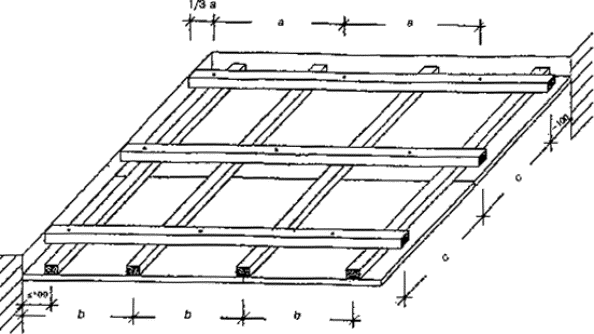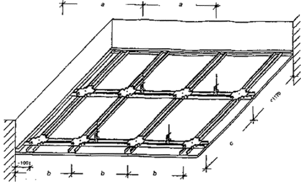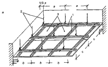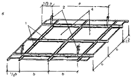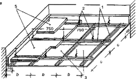 1 - каркас; 2 - подвесы; 3 - обшивка из гипсокартонных листов; 4 - кассеты из гипсокартонных листов; 5 - огнезащитный теплоизоляционный материал; а - расстояние между подвесами; b - расстояние между несущими профилями; с - расстояние между основными профилями