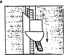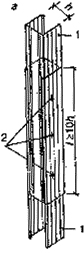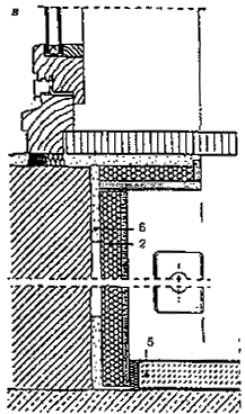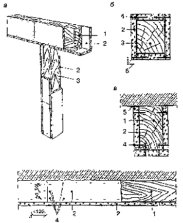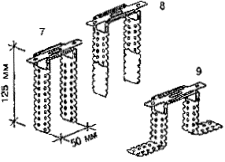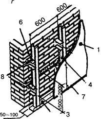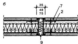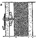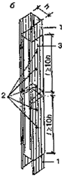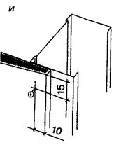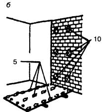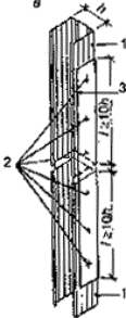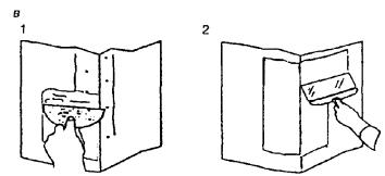 6.9.17 При заделке трещин на угловой защитной накладке (рисунок 49, в) очищают от шпаклевки отверстия в ней, предварительно укрепив ее винтами с шагом 150 мм, а затем шпателем наносят тонкий слой шпаклевки на трещину (рисунок 49, в1), разравнивают ее (рисунок 49, в2) и после твердения выполняют операции в соответствии с указаниями 6.9.4.