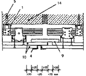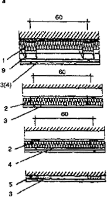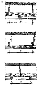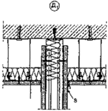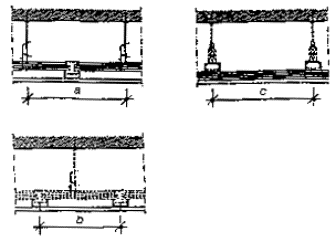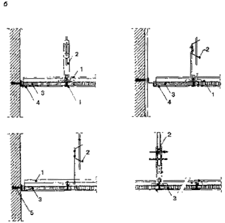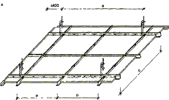 Рисунок 2 - Конструктивные схемы подвесных потолков: с обшивкой из гипсокартонных листов (а), растрового (б) и повышенной огнестойкости (в)