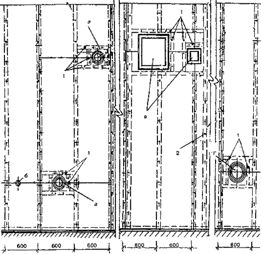 6.9.9 При заделке больших отверстий (рисунок 46) аналогично предыдущему изготавливают трафарет и наносят его контур на ГКЛ (рисунок 46, 1), а затем прорезают отверстие (рисунок 46, 2).