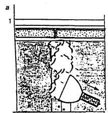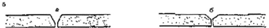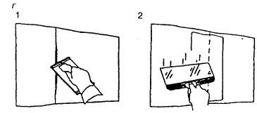 6.9.16 При заделке трещин на ленте, наложенной на стык (рисунок 49, б), удаляют некоторое количество старой шпаклевки с поврежденного участка, наносят шпателем тонкий слой шпаклевки вокруг поврежденного участка и вдавливают им ленту (рисунок 49, б1) для заделки стыков в шпаклевку, а после разравнивания (рисунок 49, б2) и твердения операции выполняют в соответствии с указаниями 6.9.4.
