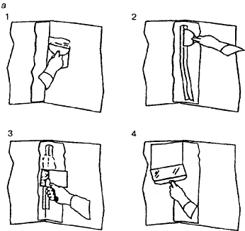 6.9.15 При заделке трещин на внутренних углах (рисунок 49, а) наносят шпателем тонкий слой шпаклевки по обе стороны угла (рисунок 49, а1), после чего, перегнув ленту вдоль ее продольной оси симметрии, накладывают ее симметрично на угол и слегка вдавливают в шпаклевку (рисунок 49, а2), а затем с помощью шпателя для внутренних углов вдавливают ленту в шпаклевку, начиная от середины трещины к ее концам (рисунок 49, а3). После разравнивания шпаклевки (рисунок 49, а4) и твердения операции выполняют в соответствии с указаниями 6.9.4.