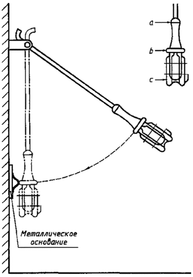 Ручной светильник для осмотра без лампы подвешивают на гибком кабеле или шнуре так, чтобы точка а светильника, указанная на рисунке 1, оказалась против ребра выступа. Точка подвеса светильника должна быть расположена на высоте 400 мм от ребра выступа. Затем светильник поднимают в вертикальной плоскости до тех пор, пока кабель или шнур не окажется в горизонтальном положении.