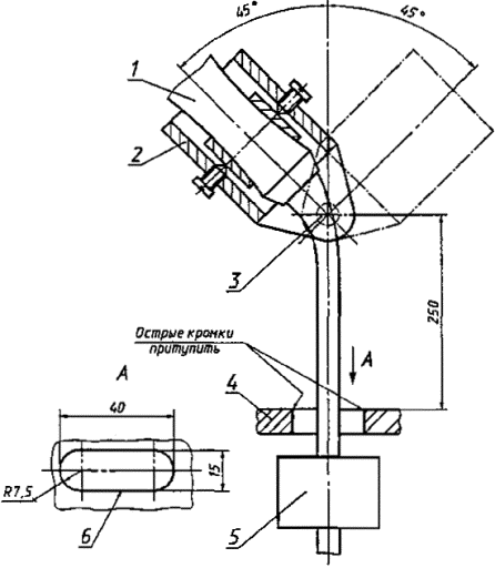 1 - образец; 2 - устройство для крепления образца; 3 - ось качания; 4 - ограничитель; 5 - груз; 6 - отверстие в ограничителе