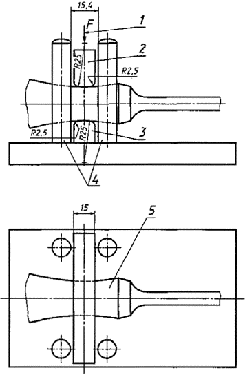 Образец сжимают двумя металлическими губками, имеющими цилиндрическую поверхность радиусом 25 мм, ширину 15 мм и длину 50 мм. Острые углы скруглены радиусом 2,5 мм.