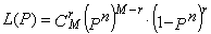 3.2. Если событие Аj представляет собой приемку партий готовой продукции из общего числа М партий, причем каждая партия подвергалась статистическому контролю и принималась при отсутствии дефектных единиц в выборке, а искомым показателем Р является вероятность выполнения задания по качеству, функция правдоподобия имеет вид: