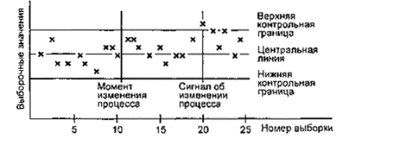 Рисунок 1 - Пример применения контрольной карты для случая, когда длина серии выборок равна 10 выборкам между моментом изменения процесса и сигналом об его изменении