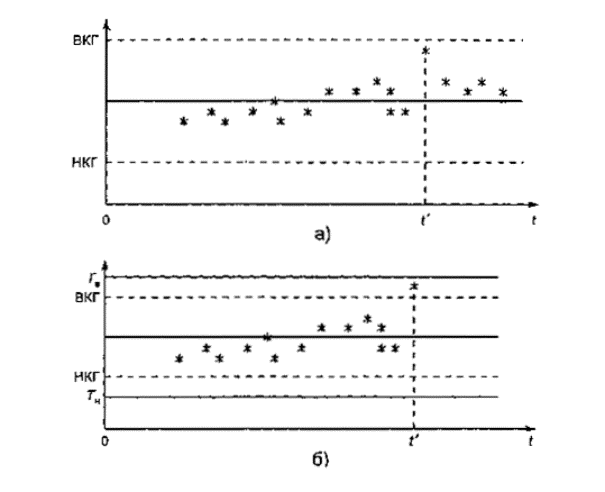 Логика работы с контрольными границами следующая: если точки на КК лежат внутри контрольных границ, то считается, что все колебания точек здесь объясняются чисто случайными факторами. Если же одна или несколько точек выходят за контрольные границы, то считается, что такие отклонения не могут произойти случайно, т.е. здесь имеет место воздействие неслучайного фактора. В первой задаче - это повод для обнаружения такого фактора, во второй задаче - повод для остановки и (или) корректировки ТП.