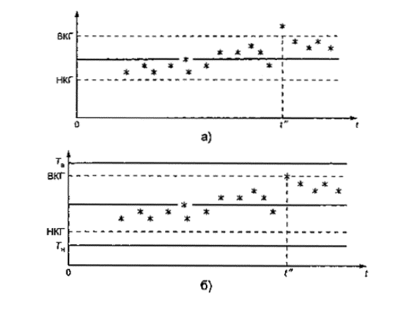Рисунок А.2 - Контрольная карта Шухарта (а) и приемочная контрольная карта средних арифметических значений мгновенных выборок (б) в момент времени t¢¢