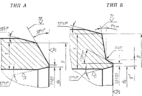 1.2. Детали трубопроводов изготавливают четырех исполнений. Для конкретной марки стали каждому исполнению соответствуют конкретные значения условного и пробного давления, приведенные в табл. 1.