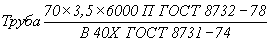 Труба с наружным диаметром 70 мм, толщиной стенки 3,5 мм, длиной 6000 мм (мерная длина), повышенной точности изготовления, из стали марки 40Х, изготовляется по группе В ГОСТ 8731: