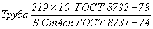 Труба с наружным диаметром 219 мм, толщиной стенки 10 мм, немерной длины, обычной точности изготовления, из стали марки Ст4сп, категория стали 1, изготовляется по группе Б ГОСТ 8731 из слитка: