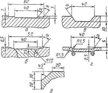 а - жесткое формирующее устройство с противоподрезной канавкой; б - эластичное (шарнирное) формирующее устройство с противоподрезной канавкой; в - жесткое формирующее устройство для увеличенной выпуклости шва; г - медная водоохлаждаемая накладка с канавкой под выпуклость шва, выполненной штамповкой; д - жесткое формирующее устройство для углового шва.