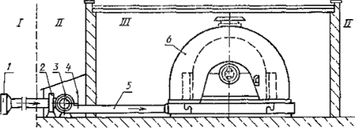 1 - фильтр; 2 - нагреватель; 3 - вентилятор подачи защитного газа; 4 - заслонка для регулирования количества защитного газа; 5 - входящий газопровод; 6 - электродвигатель