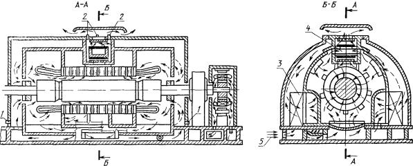 1 - штуцера для подключения приборов, контролирующих избыточное давление в оболочке электродвигателя; 2 - штуцера для подключения приборов контролирующих работу продувочного клапана; 3 - охладитель защитного газа; 4 - продувочный клапан; 5 - подача защитного газа из входящего газопровода