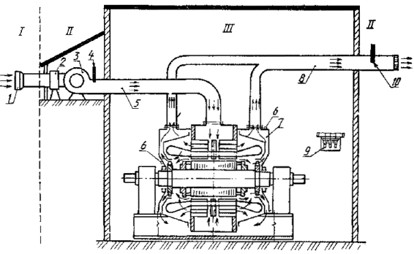 1 - фильтр; 2 - нагреватель; 3 - вентилятор подачи защитного газа; 4 - заслонка для регулирования количества защитного газа; 5 - входящий газопровод; 6 - штуцера для подключения приборов контроля избыточного давления в оболочке электродвигателя; 7 - электродвигатель; 8 - исходящий газопровод; 9 - вводное устройство электродвигателя; 10 - заслонка для регулирования значения избыточного давления
