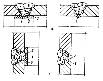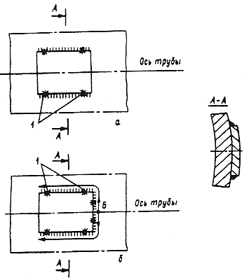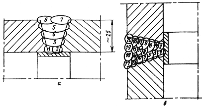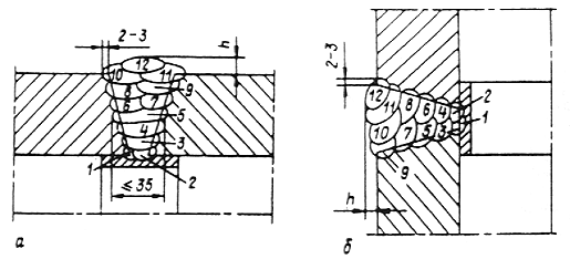 а) стыки трубопроводов предпочтительнее сваривать комбинированным способом: корневую часть шва - ручной или автоматической аргонодуговой сваркой неплавящимся электродом, остальное сечение - ручной дуговой сваркой покрытыми электродами, при этом стык сваривают без остающегося подкладного кольца; если применяют сварное соединение с подкладным остающимся кольцом, весь шов (включая корневой слой) можно выполнять ручной дуговой сваркой;