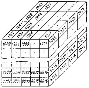 Ящики второго штабеля нумеруем от 0000 до 1999 по черт. 4. Если за начало отсчета взять строку 16 колонки 9 в табл. 2 СТ СЭВ 546-77, то отбрасывая числа больше 1999, получим числа 1858, 1961, 0061, 1270, 0076, 1860, 1392, 1743, 1838, 0716, 1167, 1028, 1099, 0267, 1675, 0221, 0709, 1577, 178l, 0891, 1953 и т.д. до тех пор, пока не наберем 40 чисел. Следовательно, для контроля необходимо взять: 61, 76, 221, 267, 709, 716, 891, 1028, 1099, 1167, 1270, 1392, 1577, 1675, 1743, 1781, 1838, 1860, 1953, 1961 и т.д. ящики.