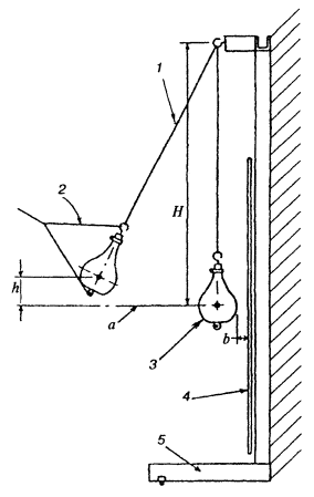 1 - стальной трос диаметром 2,5 - 4 мм; 2 - уздечка для подъема мешка; 3 - кожаный мешок (мягкое тело); 4 - испытываемый образец, закрепленный в стенде; 5 - опора; Н - высота подвеса; h - высота падения мешка; a - центральная ось испытываемого образца; b - расстояние между образцом и мешком, висящим в свободном состоянии