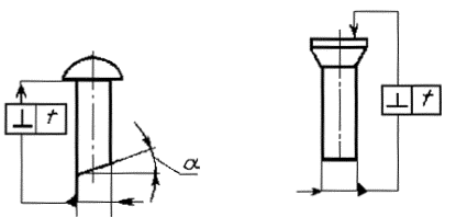 допуск перпендикулярности опорной и торцовой поверхностей головок относительно оси стержня (черт. 1) t; t = 0,0175D для класса точности В и t = 0,0349D для класса точности С;