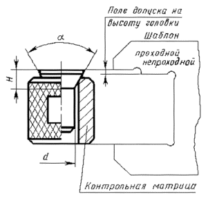 3.7. Отклонение от перпендикулярности опорной поверхности головки к оси стержня проверяют угловым шаблоном или щупом по просвету между опорной поверхностью головки и торцевой поверхностью контрольной матрицы.