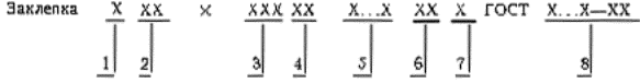 3-длина; 4-условное обозначение марки (группы) материала; 5-марка материала. Указывается для групп 01, 03, 21, 38 и для материала, не предусмотренного в настоящем стандарте. Допускается не указывать марку материала для групп 01, 03, 21, 38; 6-условное обозначение вида покрытия. Отсутствие покрытия не указывается; 7-толщина покрытия; 8 - обозначение стандарта на конкретный вид заклепок.