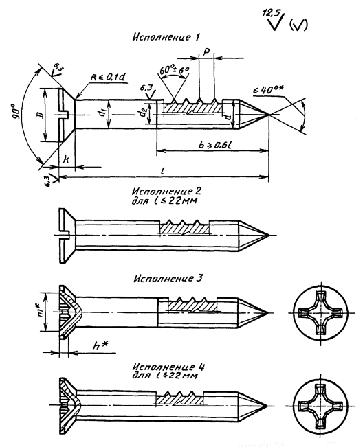 2. Конструкция и размеры шурупов должны соответствовать указанным на чертеже и в табл. 1 и 2.