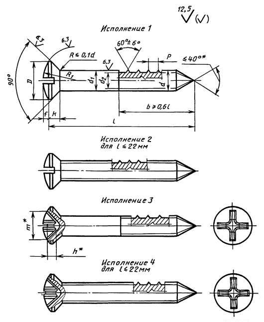 2. Конструкция и размеры шурупов должны соответствовать указанным на чертеже и в табл. 1 и 2.