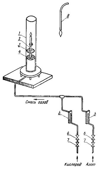 горелка 8 с наконечником диаметром 2,5 мм, обеспечивающая на любом горючем газе высоту пламени (16±4) мм и свободно входящая через открытый верхний конец кварцевой трубы;