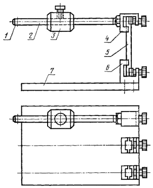 1 - ось указателя деформации; 2 - рычаг; 3 - перемещаемый груз; 4 - верхняя зажимная головка; 5 - образец; 6 - нижняя зажимная головка; 7 - опорная плита.